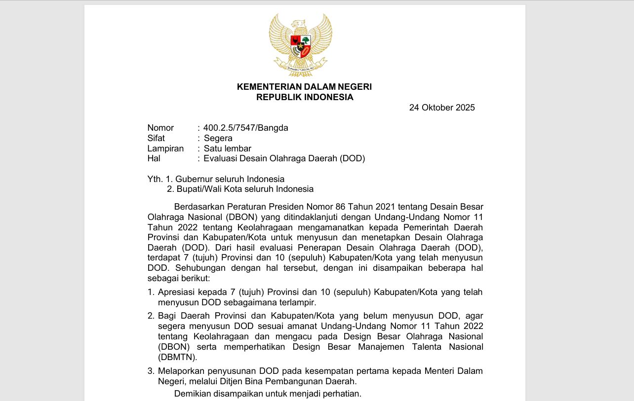 Adapun isi surat itu yakni, berdasarkan Peraturan Presiden Nomor 86 Tahun 2021 tentang Desain Besar Olahraga Nasional (DBON) yang ditindaklanjuti dengan Undang-Undang Nomor 11 Tahun 2022 tentang Keolahragaan, mengamanatkan kepada Pemerintah Daerah Provinsi dan Kabupaten/Kota untuk menyusun dan menetapkan DOD.