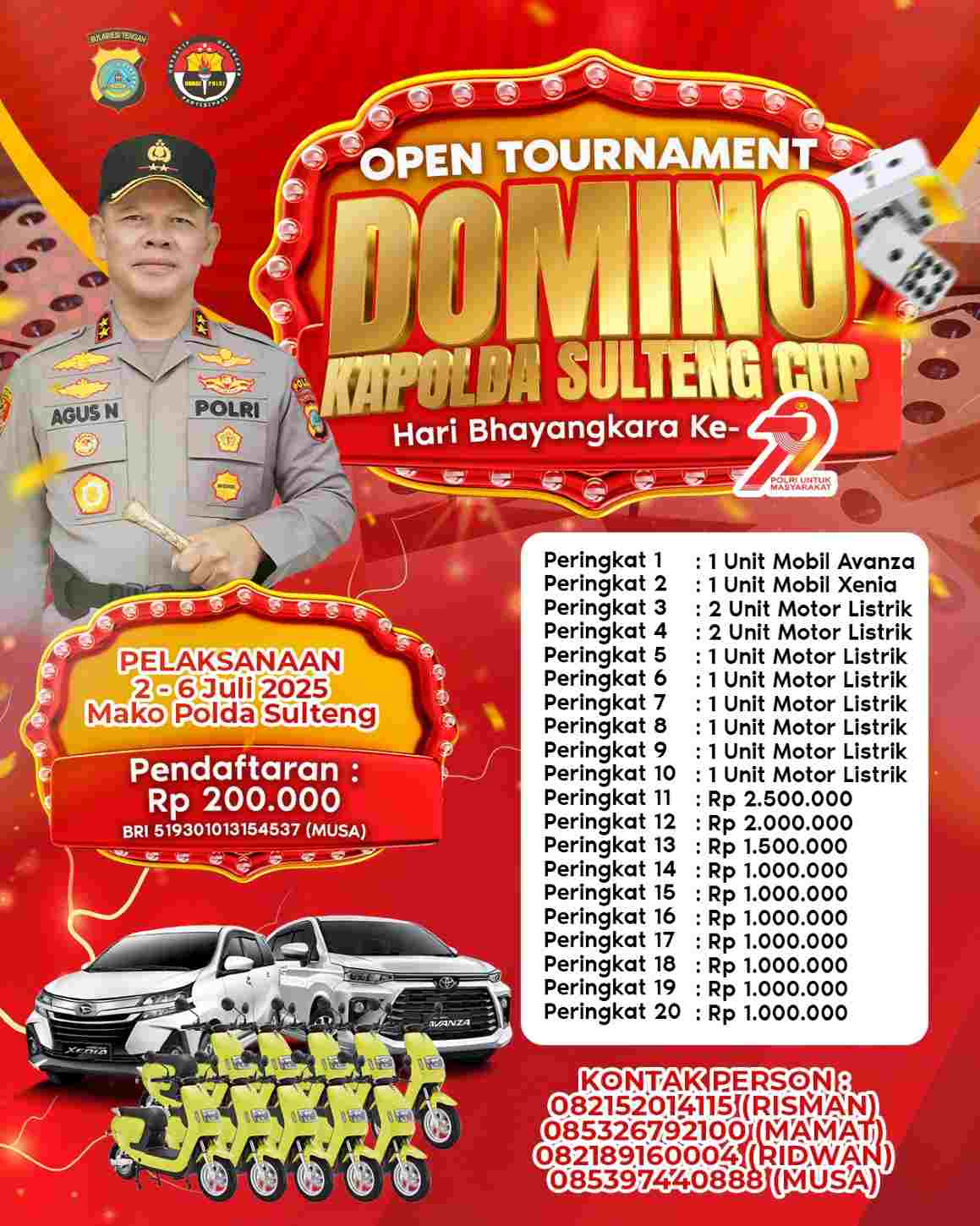 Bagi masyarakat yang ingin mendaftar sebagai peserta Open Tournament Domino Kapolda Sulteng Cup Hari Bhayangkara ke-79 Polda Sulteng, panitia menyiapkan beberapa nomor kontak.