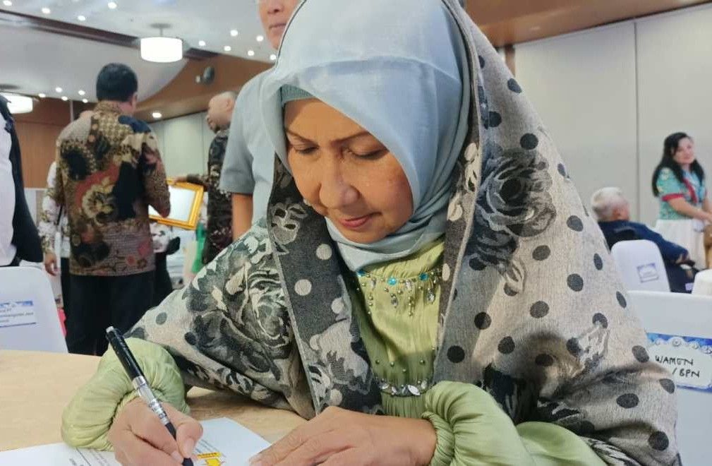 Ketua Umum JANGKAR, Fatiyah Suryani Mile saat menandatangani MoU dengan Kementerian Kelautan dan Perikanan (KKP), Kamis (4/12/2025). (Foto Istimewa)