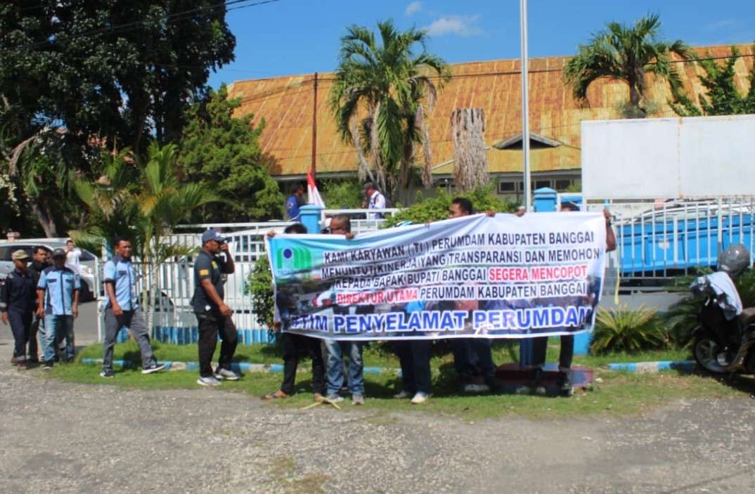 Aksi demo karyawan Perumda Air Minum Kabupaten Banggai, Senin (16/06/2025). Mereka meminta kepada Bupati Banggai untuk mencopot Bachruddin Amir dari jabatan Direktur Utama Perumda Air Minum Kabupaten Banggai.