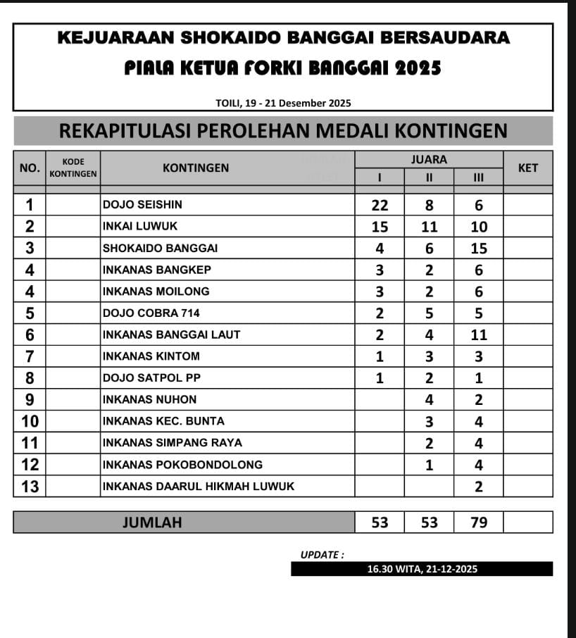 Posisi runner-up ditempati INKAI Luwuk dengan raihan 15 emas, 11 perak, dan 10 perunggu, sementara Shokaido Banggai harus puas di peringkat ketiga dengan 4 emas, 6 perak, dan 15 perunggu.